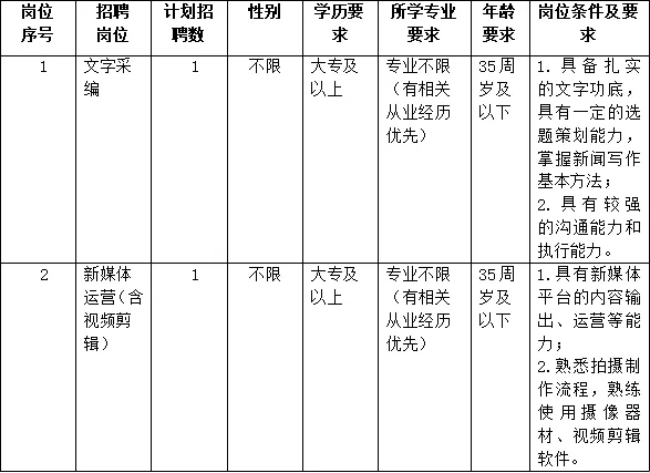 因工作需要,舟山傳媒文化有限公司面向社會(huì)公開(kāi)招聘2名工作人員(勞務(wù)派遣性質(zhì)),現(xiàn)將有關(guān)事項(xiàng)公告如下: