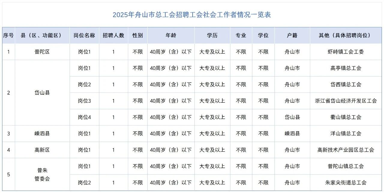 因工作需要,舟山市總工會現(xiàn)面向社會統(tǒng)一公開招聘工會社會工作者。根據浙江省總工會《關于印發(fā)<浙江省工會社會工作者管理辦法(試行)>的通知》(浙總工發(fā)〔2025〕21號)要求,現(xiàn)將有關事項公告如下: