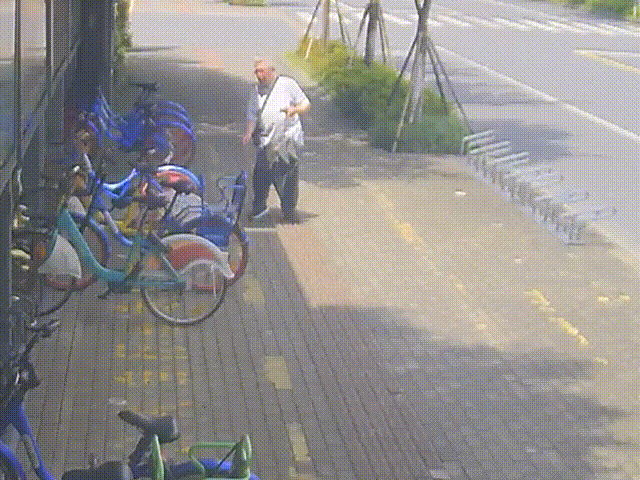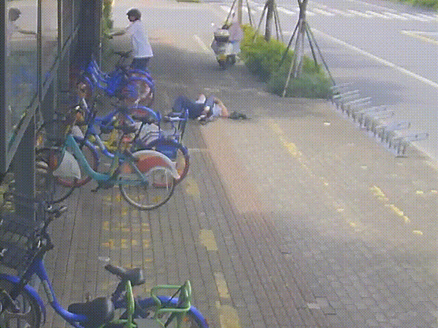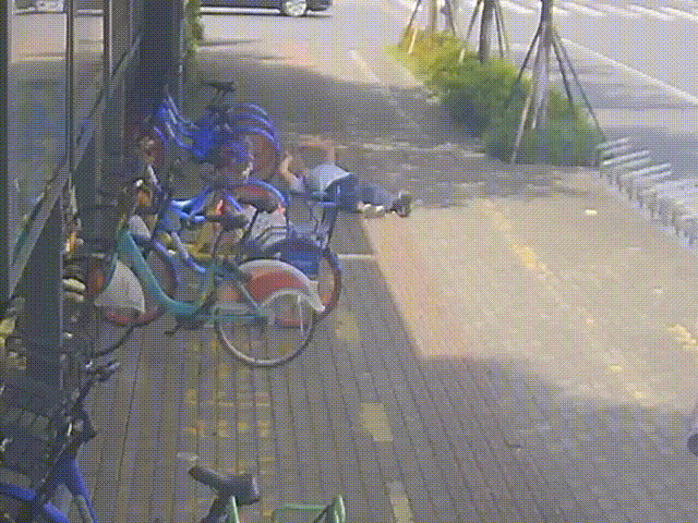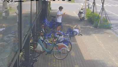 他又將路邊的共享單車搬來