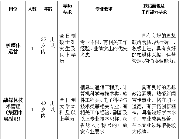 舟山市傳媒集團(tuán)有限公司因事業(yè)發(fā)展需要,面向社會(huì)公開招聘2名高素質(zhì)人才(集團(tuán)聘用性質(zhì)),具體要求如下: