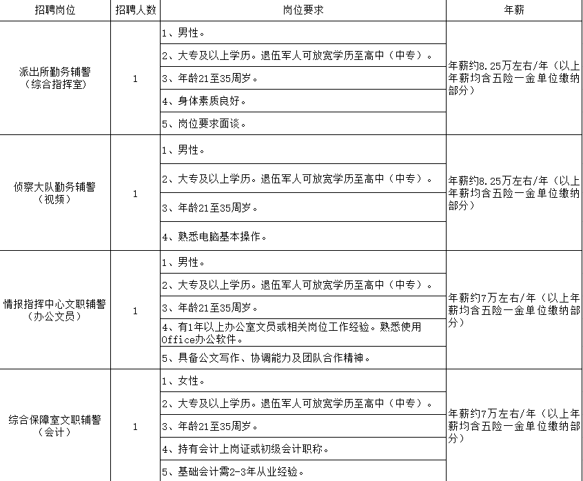 警務(wù)輔助人員年薪參考上述表格。對(duì)錄用擬聘用人員簽訂聘用合同,實(shí)行合同管理。年薪均包含五險(xiǎn)一金單位繳納部分。報(bào)名聯(lián)系方式